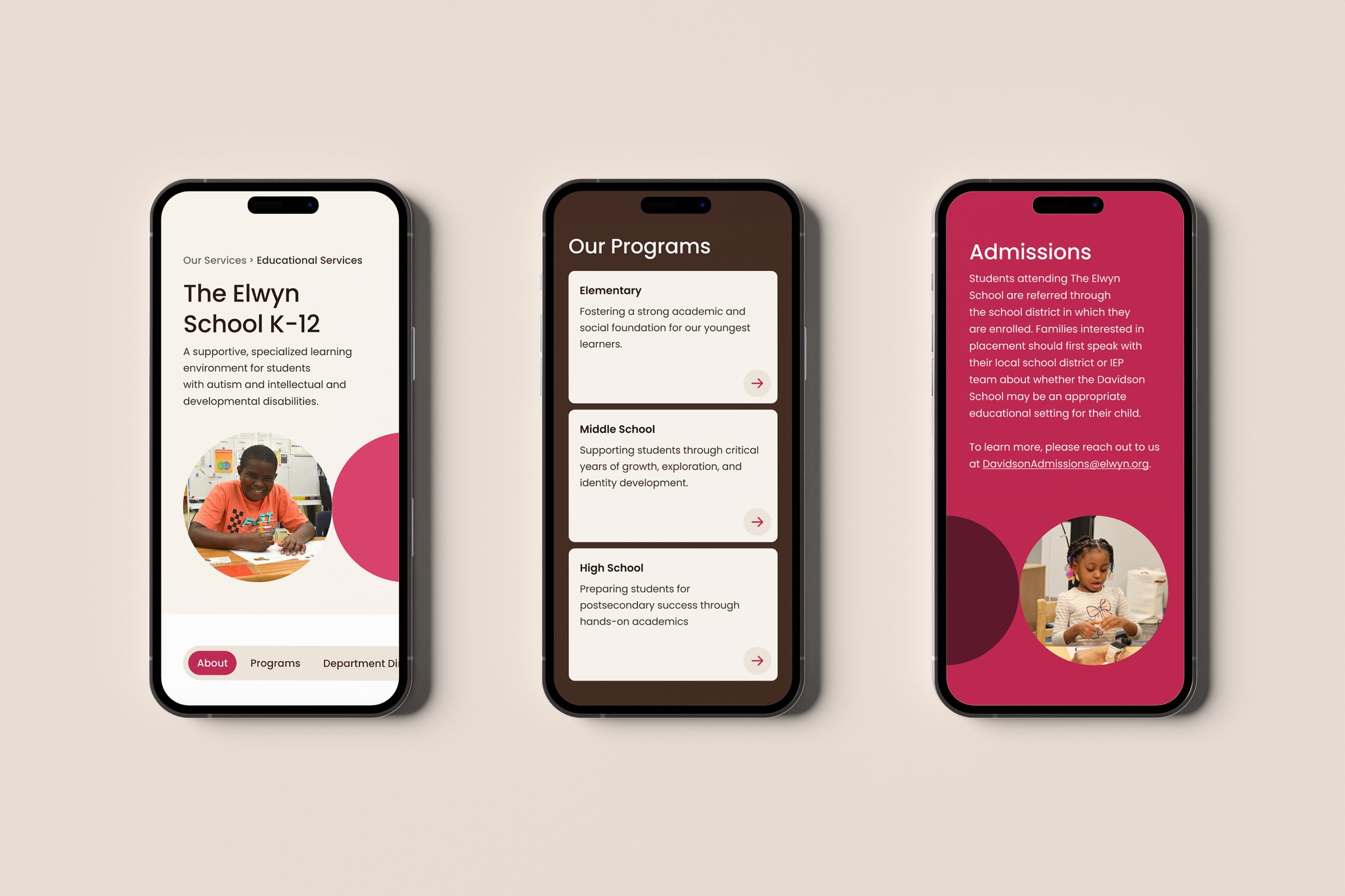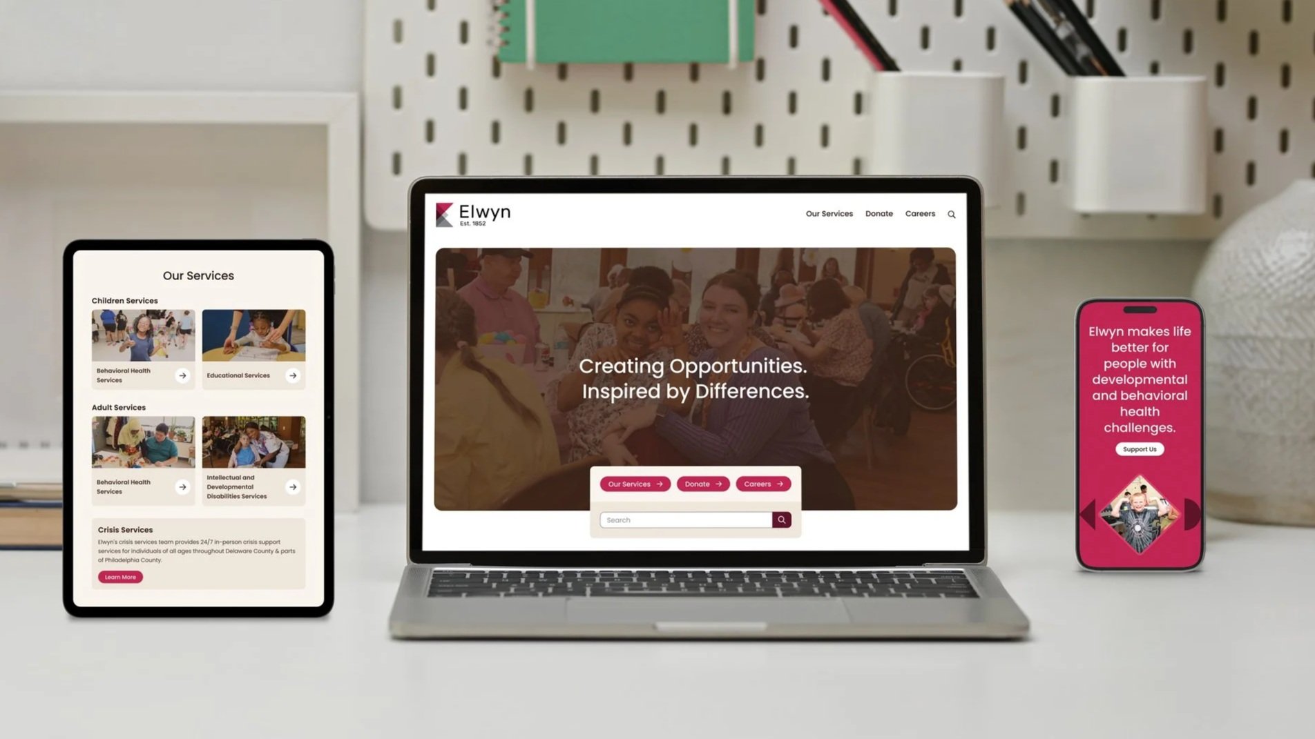 The Elwyn website redesign modernized the organization’s digital presence by evolving the brand, enhancing the user experience, and crafting a more engaging digital environment. The refreshed brand introduced warmer colors, rounded corners, and a wider range of shapes, creating a friendlier, more human-centered aesthetic while subtly reflecting neurodiversity and inclusivity. Services were reorganized into intuitive groupings with standardized information, making it easier for visitors to find critical details about programs, access, and resources.